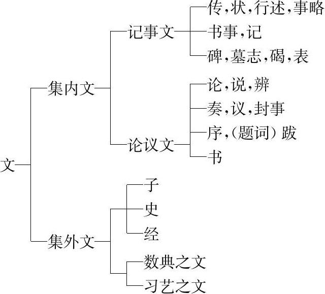 我们普通讲文,大概指集部而言,那经、史、子,文非不佳,而不以文称。但上表所列文的分类中,以“传”而论,“四史”中列传已在集部以外,“本纪”、“世家”和“传”是同性质的,也非集部所有,集部只有“家传”。以“论”而论,除了文人单篇的论文,也有在集部以外的。譬如:庄子《齐物论》,荀子《礼论》、《乐论》,贾谊《过秦论》都是子部所有的。以“序”而论,也只单篇的,集中所已备;那连合的序,若《四库提要》,就非集部所有。至如“编年史”中《左传》、《资治通鉴》之类和“名人年谱”,都是记事文,也非集部所能包了。